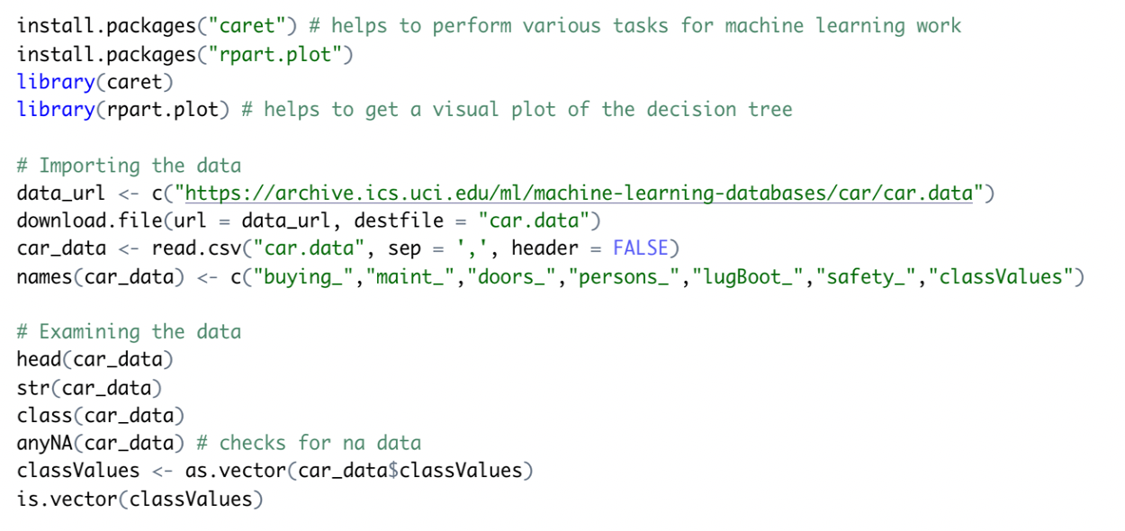 I have used the car evaluation data set from the uci machine learning repository website. Importing and examining the data. Car Evaluation Data Set from UC Irvine Machine Learning Repository.